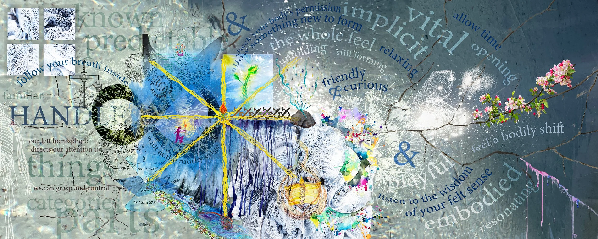 On the left side are references to things and categories - thinking, organizing, and grasping what we already know and can hold on to (like a handle). In the middle and right side are references to breathing and turning our attention to our inner world, which leads to the somatic experience of opening up to a whole feel, something still forming, unfolding, and emerging. This is where creative expression tends to happen, in often mysterious, playful, and unexpected ways.