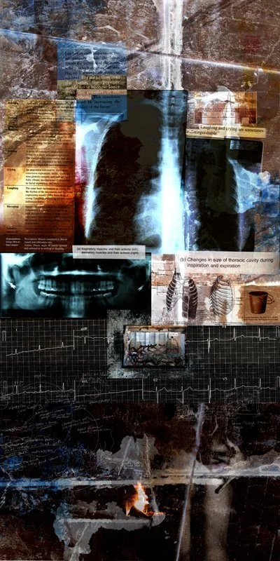 The x-rays are my lungs and teeth, and there is an electro-cardiogram of my heartbeat. Near the teeth, there is also a scientific description of the muscles used to make us smile. This is about understanding how to smile, and how a heart beats, but being unable to experience the joy that makes these actions truly happen.