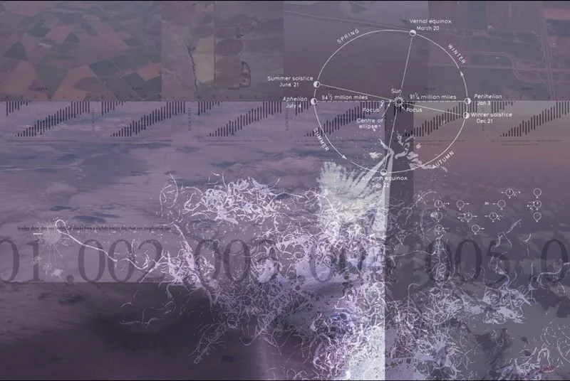 Synchronize was created in Photoshop, using several arial photographs that I took from an airplane, combined with scanned graphics about planetary cycles, sleep patterns, and other textures, images and type.