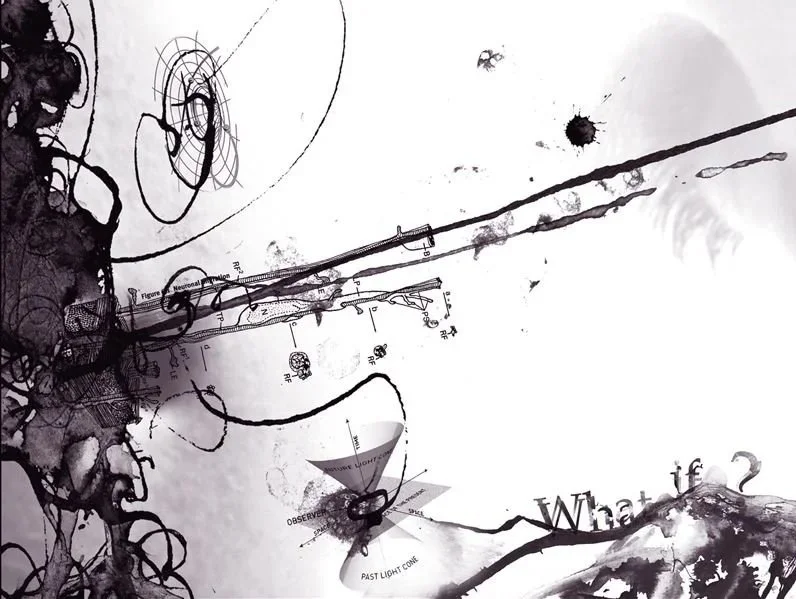 What If? was composed in Adobe Photoshop with scans of hand-made ink marks, photos, type, and graphics about biology and theories of time.